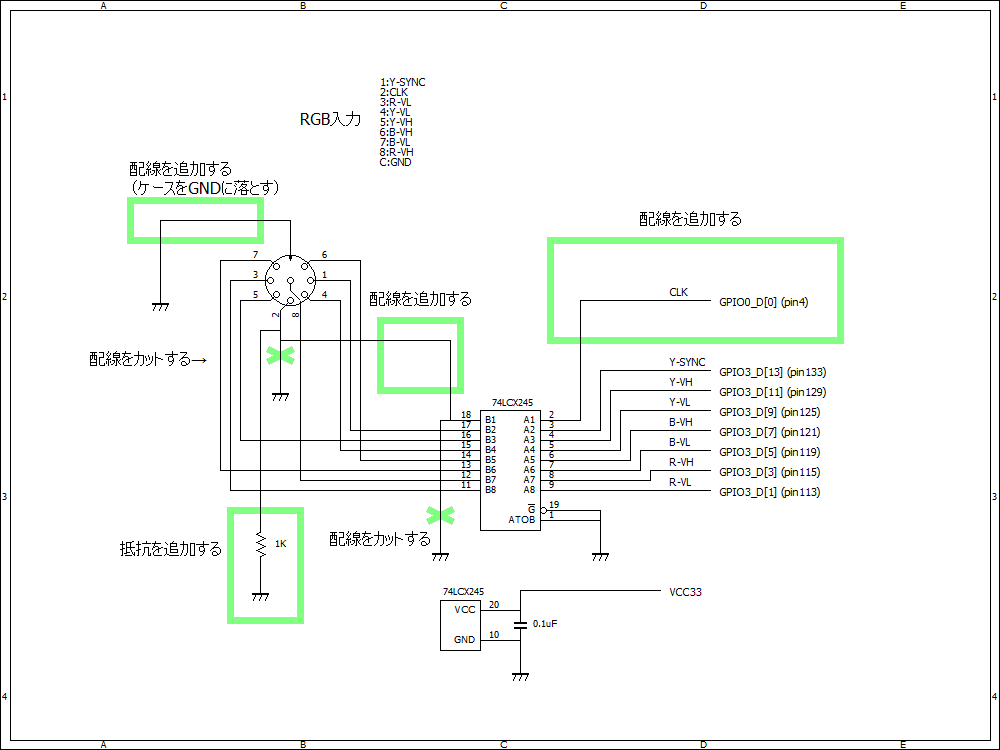 RGBコンバータ(19)(本体側実装) RGBコンバータの初代機用実装について、私が行った方法を紹介します。 まず、初代機用RGBコンバータ回路図(本体側)を組み立てます。 初代機用RGBコンバータ基板(本体側) <…