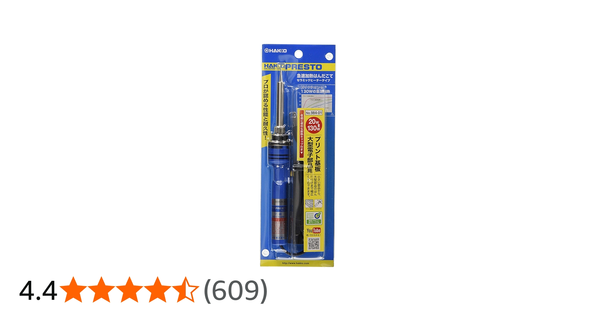 白光(HAKKO) PRESTO 急速加熱はんだこて 20/130W(スイッチオン時) 耐熱キャップ付き 984-01